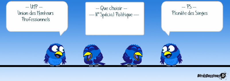 Case 1:Bird 1: -- UMP -- Union des Menteurs Professionnels Case 2:Bird 1: -- Que choisir -- --- N° Spécial Politique --- Case 3:Bird 1: -- PS -- Planète des Singes