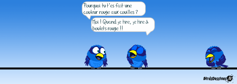 Case 1: Case 2:Bird 1: Pourquoi tu t’es fait une couleur rouge aux couilles ?Bird 2: Moi ! Quand je tire, je tire à boulets rouge !! Case 3: