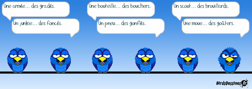 Case 1:Bird 1: Une armée... des gradés.Bird 2: Un junkie... des foncés. Case 2:Bird 1: Une bouteille... des bouchers.Bird 2: Un pneu... des gonflés. Case 3:Bird 1: Un scout... des brouillards.Bird 2: Une moue... des goûters.