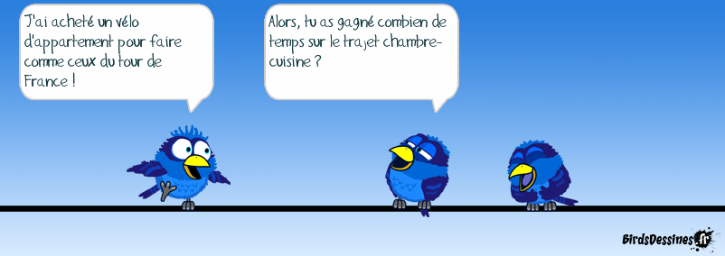 Case 1:Bird 1: J'ai acheté un vélo d'appartement pour faire comme ceux du tour de France ! Case 2:Bird 1: Alors, tu as gagné combien de temps sur le trajet chambre-cuisine ? Case 3: