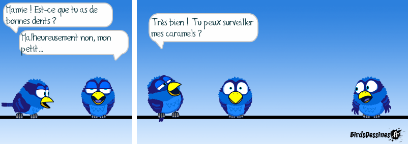Case 1:Bird 1: Mamie ! Est-ce que tu as de bonnes dents ?Bird 2: Malheureusement non, mon petit… Case 2:Bird 1: Très bien ! Tu peux surveiller mes caramels ? Case 3: