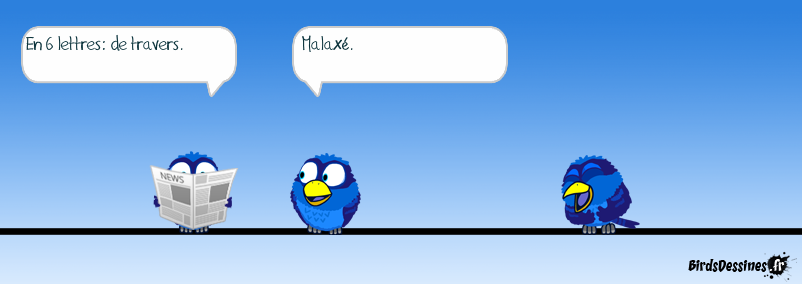 Case 1:Bird 1: En 6 lettres: de travers. Case 2:Bird 1: Malaxé. Case 3:
