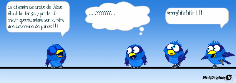 Case 1:Bird 1: Le chemin de croix de Jésus était la 1er gay pride…Il avait quand même sur la tête une couronne de pines !!! Case 2:Bird 1: .....???????... Case 3:Bird 1: Arrrrghhhhhh !!!!