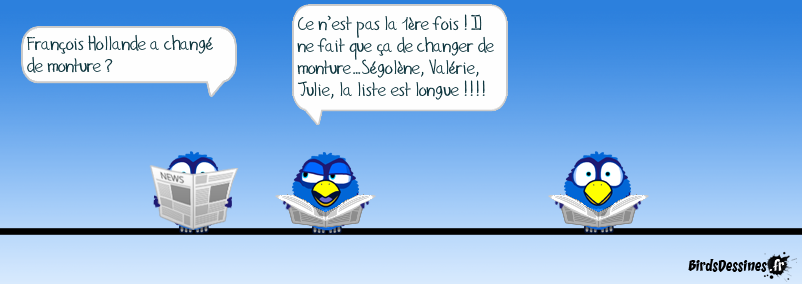 Case 1:Bird 1: François Hollande a changé de monture ? Case 2:Bird 1: Ce n’est pas la 1ère fois ! Il ne fait que ça de changer de monture…Ségolène, Valérie, Julie, la liste est longue !!!! Case 3: