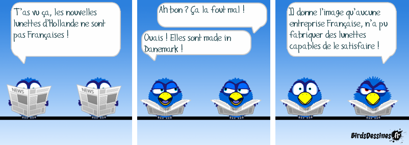 Case 1:Bird 1: T’as vu ça, les nouvelles lunettes d’Hollande ne sont pas Françaises ! Case 2:Bird 1: Ah bon ? Ça la fout mal !Bird 2: Ouais ! Elles sont made in Danemark ! Case 3:Bird 1: Il donne l’image qu’aucune entreprise Française, n’a pu fabriquer des lunettes capables de le satisfaire !