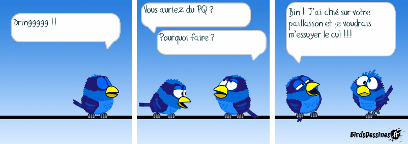 Case 1:Bird 1: Dringgggg !! Case 2:Bird 1: Vous auriez du PQ ?Bird 2: Pourquoi faire ? Case 3:Bird 1: Bin ! J’ai chié sur votre paillasson et je voudrais m’essuyer le cul !!!