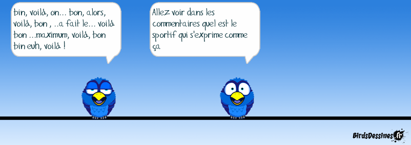 Case 1:Bird 1: bin, voilà, on... bon, alors, voilà, bon , ..a fait le... voilà bon ...maximum, voilà, bon bin euh, voilà ! Case 2:Bird 1: Allez voir dans les commentaires quel est le sportif qui s'exprime comme ça Case 3: