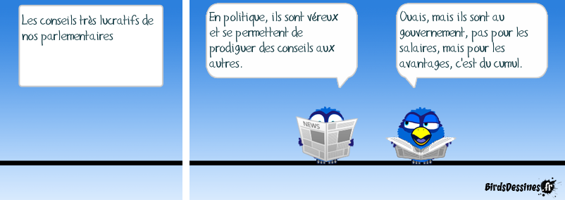 Case 1:Bird 1: Les conseils très lucratifs de nos parlementaires Case 2:Bird 1: En politique, ils sont véreux et se permettent de prodiguer des conseils aux autres. Case 3:Bird 1: Ouais, mais ils sont au gouvernement, pas pour les salaires, mais pour les avantages, c'est du cumul.