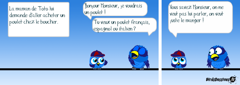 Case 1:Bird 1: La maman de Toto lui demande d'aller acheter un poulet chez le boucher. Case 2:Bird 1: Bonjour Monsieur, je voudrais un poulet !Bird 2: Tu veux un poulet français, espagnol ou italien ? Case 3:Bird 1: Vous savez Monsieur, on ne veut pas lui parler, on veut juste le manger !