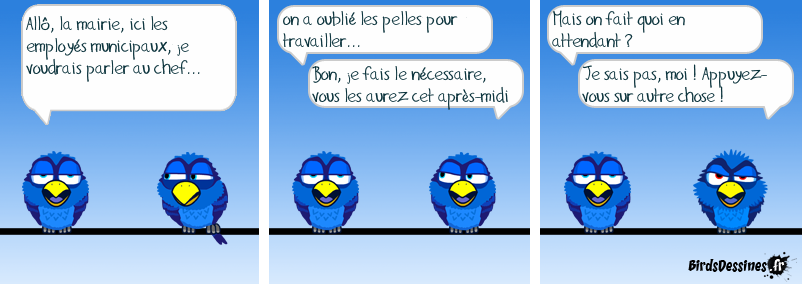 Case 1:Bird 1: Allô, la mairie, ici les employés municipaux, je voudrais parler au chef... Case 2:Bird 1: on a oublié les pelles pour travailler...Bird 2: Bon, je fais le nécessaire, vous les aurez cet après-midi Case 3:Bird 1: Mais on fait quoi en attendant ?Bird 2: Je sais pas, moi ! Appuyez-vous sur autre chose !