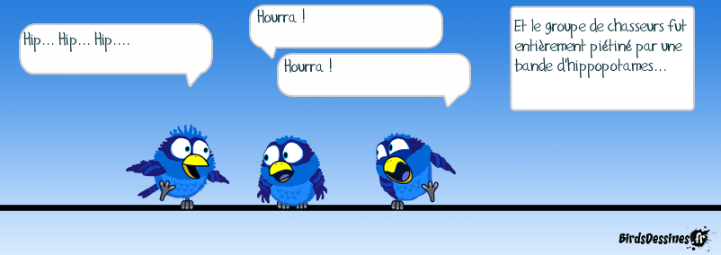 Case 1:Bird 1: Hip... Hip... Hip.... Case 2:Bird 1: Hourra !Bird 2: Hourra ! Case 3:Bird 1: Et le groupe de chasseurs fut entièrement piétiné par une bande d'hippopotames...