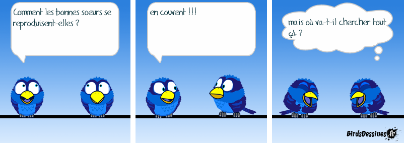 Case 1:Bird 1: Comment les bonnes soeurs se reproduisent-elles ? Case 2:Bird 1: en couvent !!! Case 3:Bird 1: mais où va-t-il chercher tout çà ?