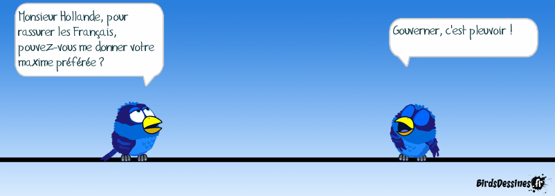 Case 1:Bird 1: Monsieur Hollande, pour rassurer les Français, pouvez-vous me donner votre maxime préférée ? Case 2: Case 3:Bird 1: Gouverner, c'est pleuvoir !