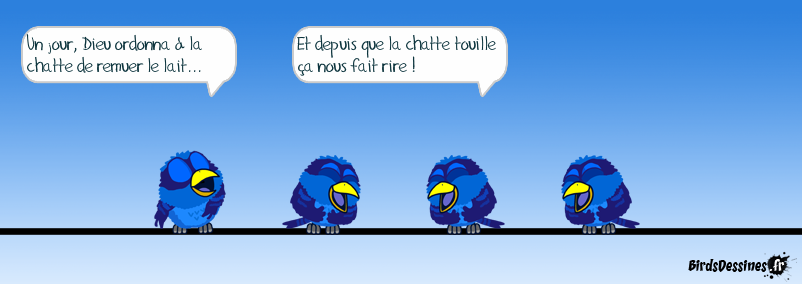 Case 1:Bird 1: Un jour, Dieu ordonna à la chatte de remuer le lait... Case 2:Bird 1: Et depuis que la chatte touille ça nous fait rire ! Case 3: