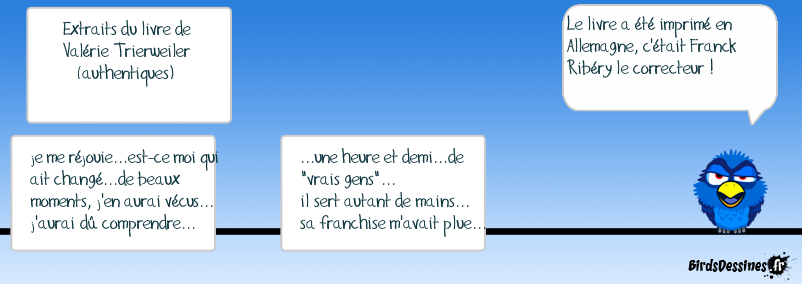 Case 1:Bird 1: Extraits du livre de Valérie Trierweiler (authentiques) Case 2: Case 3:Bird 1: Le livre a été imprimé en Allemagne, c'était Franck Ribéry le correcteur !