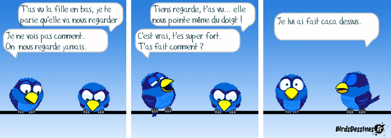 Case 1:Bird 1: T'as vu la fille en bas, je te parie qu'elle va nous regarderBird 2: Je ne vois pas comment. On nous regarde jamais. Case 2:Bird 1: Tiens regarde, t'as vu... elle nous pointe même du doigt !Bird 2: C'est vrai, t'es super fort. T'as fait comment ? Case 3:Bird 1: Je lui ai fait caca dessus.