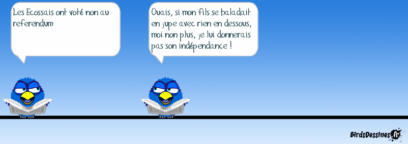 Case 1:Bird 1: Les Ecossais ont voté non au referendum Case 2:Bird 1: Ouais, si mon fils se baladait en jupe avec rien en dessous, moi non plus, je lui donnerais pas son indépendance ! Case 3: