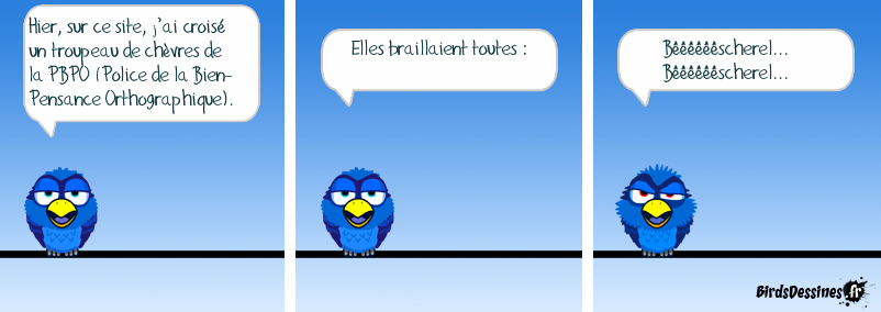 Case 1:Bird 1: Hier, sur ce site, j’ai croisé un troupeau de chèvres de la PBPO (Police de la Bien-Pensance Orthographique). Case 2:Bird 1: Elles braillaient toutes : Case 3:Bird 1: Bêêêêêêscherel... Bêêêêêêscherel...