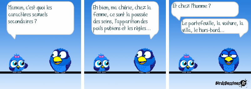 Case 1:Bird 1: Maman, c'est quoi les caractères sexuels secondaires ? Case 2:Bird 1: Eh bien, ma chérie, chez la femme, ce sont la poussée des seins, l'apparition des poils pubiens et les règles... Case 3:Bird 1: Et chez l'homme ?Bird 2: Le portefeuille, la voiture, la villa, le hors-bord...