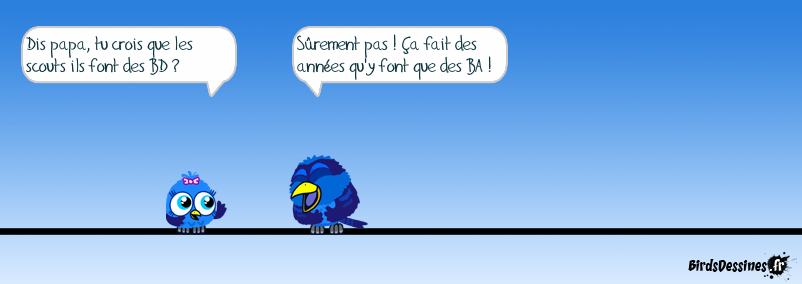 Case 1:Bird 1: Dis papa, tu crois que les scouts ils font des BD ? Case 2:Bird 1: Sûrement pas ! Ça fait des années qu'y font que des BA ! Case 3: