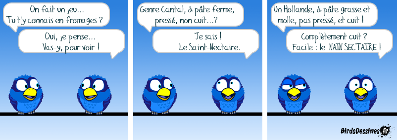Case 1:Bird 1: On fait un jeu... Tu t'y connais en fromages ?Bird 2: Oui, je pense... Vas-y, pour voir ! Case 2:Bird 1: Genre Cantal, à pâte ferme, pressé, non cuit...?Bird 2: Je sais ! Le Saint-Nectaire. Case 3:Bird 1: Un Hollande, à pâte grasse et molle, pas pressé, et cuit !Bird 2: Complètement cuit ? Facile : le NAIN SECTAIRE !