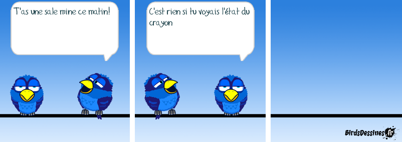 Case 1:Bird 1: T'as une sale mine ce matin! Case 2:Bird 1: C'est rien si tu voyais l'état du crayon Case 3: