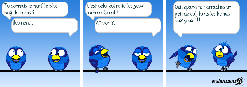 Case 1:Bird 1: Tu connais le nerf le plus long du corps ?Bird 2: Heu non... Case 2:Bird 1: C'est celui qui relie les yeux au trou du cul !!Bird 2: Ah bon ?.. Case 3:Bird 1: Oui, quand tu t'arraches un poil de cul, tu as les larmes aux yeux !!!