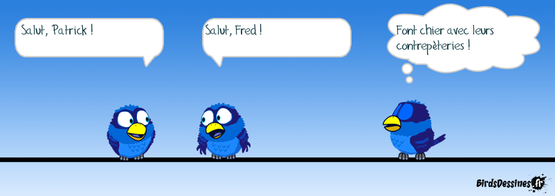 Case 1:Bird 1: Salut, Patrick ! Case 2:Bird 1: Salut, Fred ! Case 3:Bird 1: Font chier avec leurs contrepèteries !