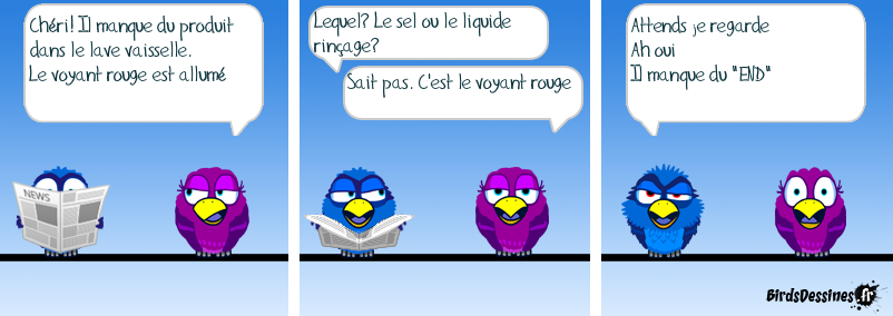 Case 1:Bird 1: Chéri! Il manque du produit dans le lave vaisselle. Le voyant rouge est allumé Case 2:Bird 1: Lequel? Le sel ou le liquide rinçage?Bird 2: Sait pas. C'est le voyant rouge Case 3:Bird 1: Attends je regarde Ah oui Il manque du "END"