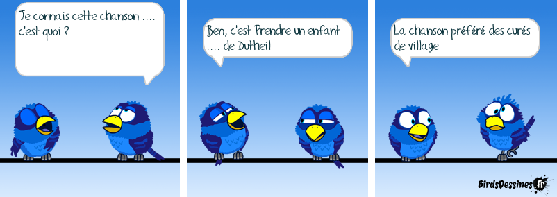 Case 1:Bird 1: Je connais cette chanson .... c'est quoi ? Case 2:Bird 1: Ben, c'est Prendre un enfant .... de Dutheil Case 3:Bird 1: La chanson préféré des curés de village