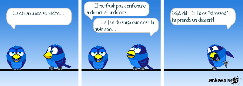 Case 1:Bird 1: Le chien aime sa niche... Case 2:Bird 1: Il ne faut pas confondre endolori et indolore...Bird 2: Le but du soigneur c'est la guérison... Case 3:Bird 1: Déjà dit : Si tu es "stressed", tu prends un dessert!