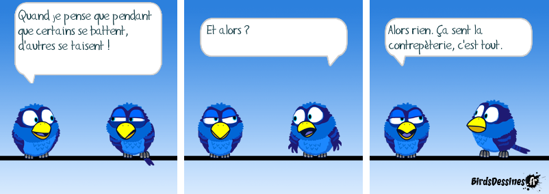 Case 1:Bird 1: Quand je pense que pendant que certains se battent, d'autres se taisent ! Case 2:Bird 1: Et alors ? Case 3:Bird 1: Alors rien. Ça sent la contrepèterie, c'est tout.