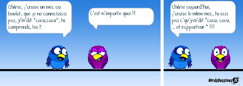 Case 1:Bird 1: Chérie, j’croise un mec au boulot, que je ne connaissais pas, y’m’dit “cocu,cocu”, tu comprends, toi ? Case 2:Bird 1: C’est n’importe quoi !! Case 3:Bird 1: Chérie aujourd’hui, j’croise le même mec, tu sais pas c’qu’y m’dit “cocu, cocu, … et rapporteur " !!!