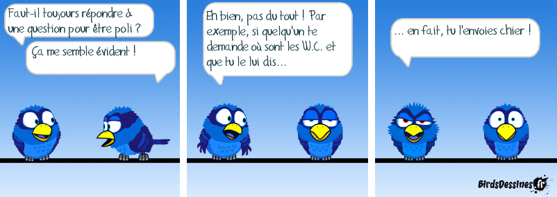 Case 1:Bird 1: Faut-il toujours répondre à une question pour être poli ?Bird 2: Ça me semble évident ! Case 2:Bird 1: Eh bien, pas du tout ! Par exemple, si quelqu'un te demande où sont les W.C. et que tu le lui dis... Case 3:Bird 1: ... en fait, tu l'envoies chier !