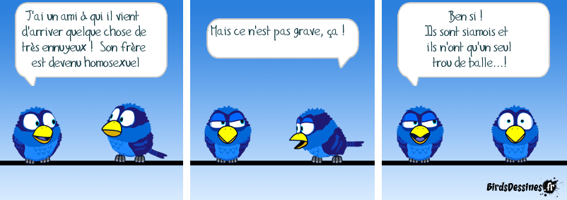 Case 1:Bird 1: J'ai un ami à qui il vient d'arriver quelque chose de très ennuyeux ! Son frère est devenu homosexuel Case 2:Bird 1: Mais ce n'est pas grave, ça ! Case 3:Bird 1: Ben si ! Ils sont siamois et ils n'ont qu'un seul trou de balle...!