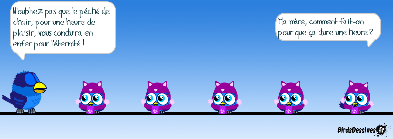 Case 1:Bird 1: N'oubliez pas que le péché de chair, pour une heure de plaisir, vous conduira en enfer pour l'éternité ! Case 2: Case 3:Bird 1: Ma mère, comment fait-on pour que ça dure une heure ?