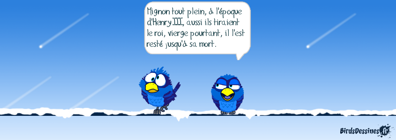 Case 1: Case 2:Bird 1: Mignon tout plein, à l'époque d'Henry III, aussi ils tiraient le roi, vierge pourtant, il l'est resté jusqu'à sa mort. Case 3: