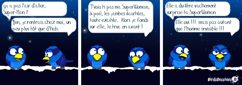 Case 1:Bird 1: ça a pas l'air d'aller, Super-Man ?Bird 2: Bin, je rentrais chez moi, un peu plus tôt que d’hab. Case 2:Bird 1: J'vois ti pas ma SuperWoman, à poil, les jambes écartées, toute excitée. Alors je fonds sur elle, le truc en avant ! Case 3:Bird 1: Elle a du être vachement surprise ta SuperWomanBird 2: Elle oui !!! mais pas autant que l’homme invisible !!!