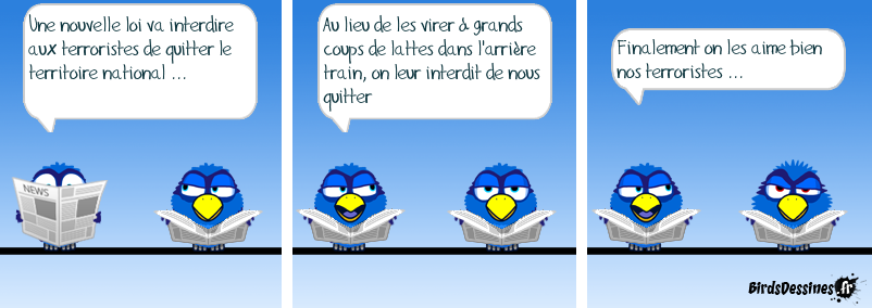 Case 1:Bird 1: Une nouvelle loi va interdire aux terroristes de quitter le territoire national ... Case 2:Bird 1: Au lieu de les virer à grands coups de lattes dans l'arrière train, on leur interdit de nous quitter Case 3:Bird 1: Finalement on les aime bien nos terroristes ...