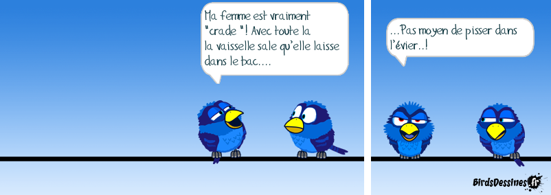 Case 1: Case 2:Bird 1: Ma femme est vraiment "crade "! Avec toute la la vaisselle sale qu’elle laisse dans le bac.... Case 3:Bird 1: ...Pas moyen de pisser dans l’évier..!