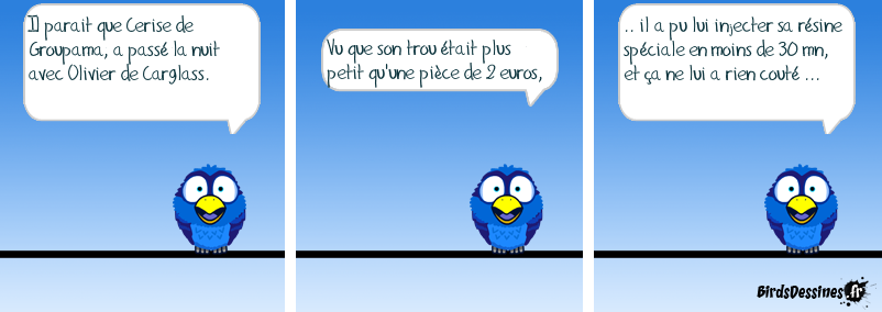 Case 1:Bird 1: Il parait que Cerise de Groupama, a passé la nuit avec Olivier de Carglass. Case 2:Bird 1: Vu que son trou était plus petit qu'une pièce de 2 euros, Case 3:Bird 1: .. il a pu lui injecter sa résine spéciale en moins de 30 mn, et ça ne lui a rien couté ...