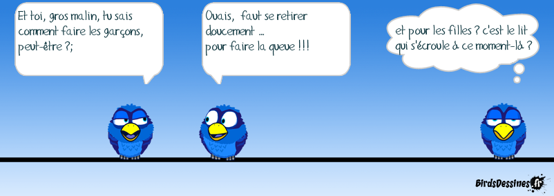 Case 1:Bird 1: Et toi, gros malin, tu sais comment faire les garçons, peut-être ?; Case 2:Bird 1: Ouais, faut se retirer doucement … pour faire la queue !!! Case 3:Bird 1: et pour les filles ? c'est le lit qui s'écroule à ce moment-là ?