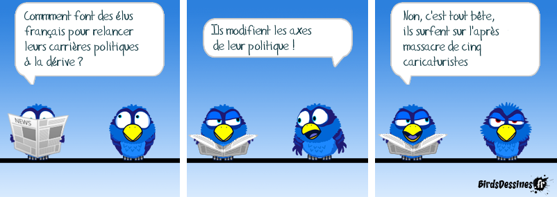 Case 1:Bird 1: Commment font des élus français pour relancer leurs carrières politiques à la dérive ? Case 2:Bird 1: Ils modifient les axes de leur politique ! Case 3:Bird 1: Non, c'est tout bête, ils surfent sur l'après massacre de cinq caricaturistes