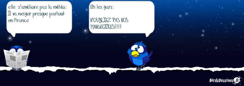 Case 1:Bird 1: elle s'améliore pas la météo: Il va neiger presque partout en France Case 2:Bird 1: Eh les gars: N'OUBLIEZ PAS NOS MANGEOIRES!!!! Case 3: