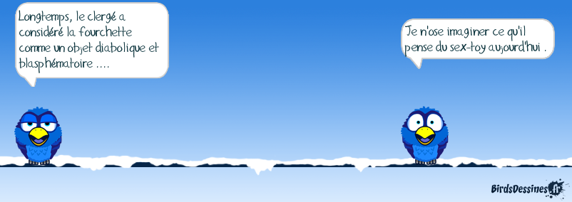 Case 1:Bird 1: Longtemps, le clergé a considéré la fourchette comme un objet diabolique et blasphématoire .... Case 2: Case 3:Bird 1: Je n'ose imaginer ce qu'il pense du sex-toy aujourd'hui .