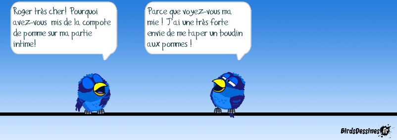 Case 1:Bird 1: Roger très cher! Pourquoi avez-vous mis de la compote de pomme sur ma partie intime! Case 2:Bird 1: Parce que voyez-vous ma mie ! J’ai une très forte envie de me taper un boudin aux pommes ! Case 3: