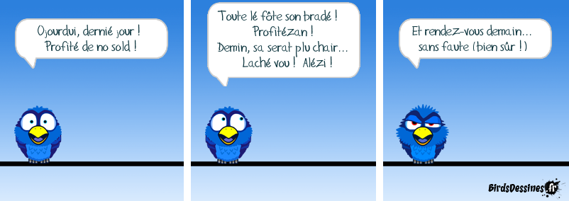 Case 1:Bird 1: Ojourdui, dernié jour ! Profité de no sold ! Case 2:Bird 1: Toute lé fôte son bradé ! Profitézan ! Demin, sa serat plu chair... Laché vou ! Alézi ! Case 3:Bird 1: Et rendez-vous demain... sans faute (bien sûr !)