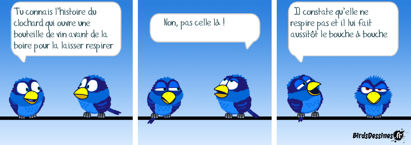 Case 1:Bird 1: Tu connais l’histoire du clochard qui ouvre une bouteille de vin avant de la boire pour la laisser respirer Case 2:Bird 1: Non, pas celle là ! Case 3:Bird 1: Il constate qu’elle ne respire pas et il lui fait aussitôt le bouche à bouche