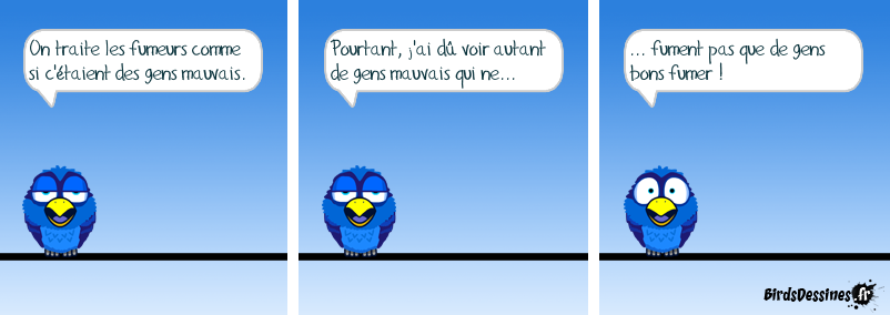 Case 1:Bird 1: On traite les fumeurs comme si c'étaient des gens mauvais. Case 2:Bird 1: Pourtant, j'ai dû voir autant de gens mauvais qui ne... Case 3:Bird 1: ... fument pas que de gens bons fumer !