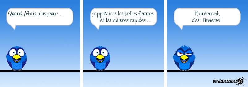 Case 1:Bird 1: Quand j'étais plus jeune... Case 2:Bird 1: j'appréciais les belles femmes et les voitures rapides ... Case 3:Bird 1: Maintenant, c'est l'inverse !
